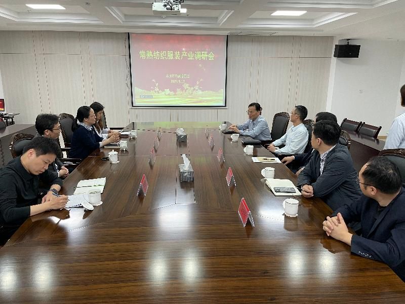 在常熟服装城集团有限公司,相关负责人介绍了服装服饰产业发展情况,谢善鸿表示服装产业转型势在必行,将积极协调金融资源服务好产业转型。