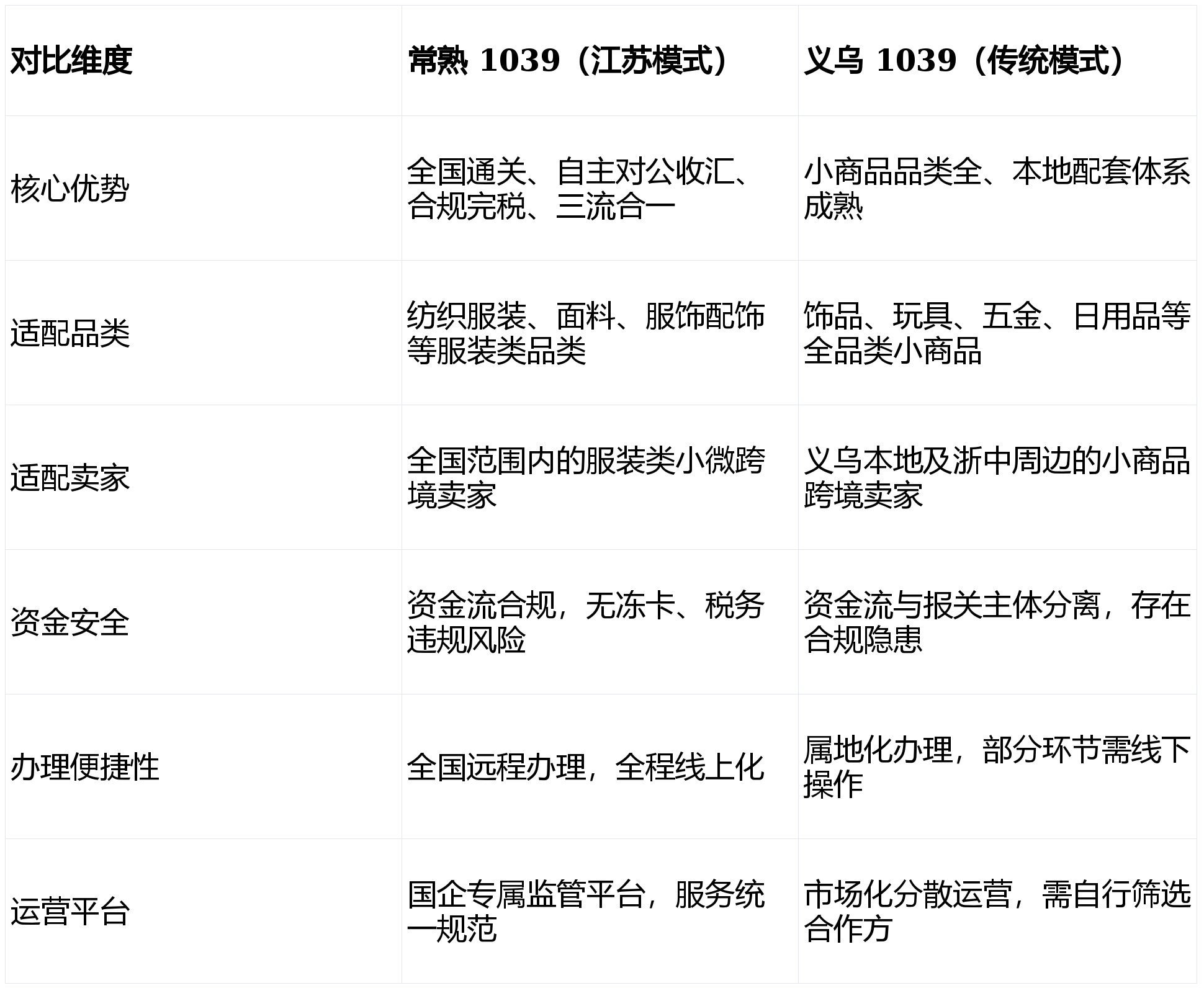 常熟与义乌的1039市场采购贸易均遵循国家统一政策框架(单票报关货值≤15万美元、无票合规出口、增值税免税等),但受两地产业基础与试点发展模式差异影响,在通关模式、收汇方式、税务征管等核心维度形成显著区别。其中,常熟依托江苏1039模式创新,与义乌传统模式构成核心差异,具体如下: